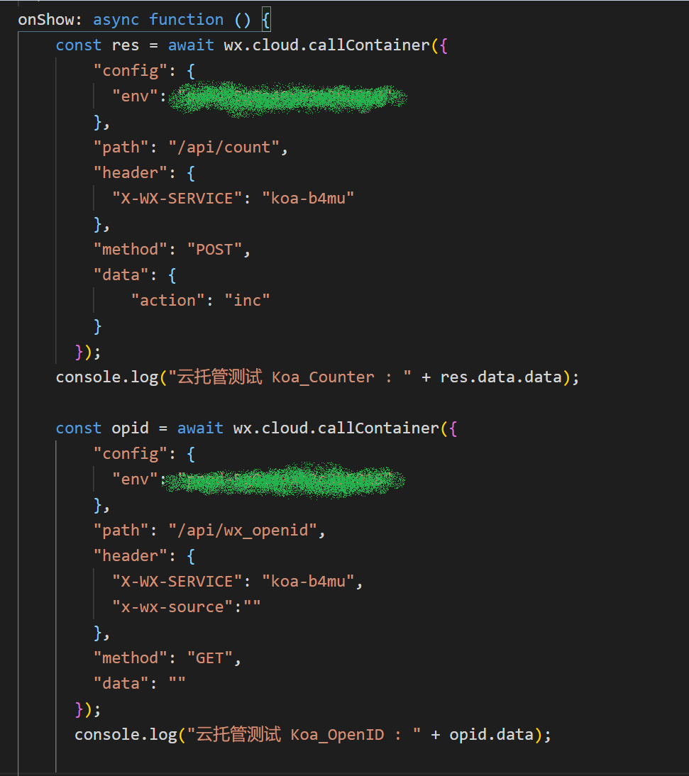 我自己排除故障了,细看腾讯官方的Koa代码,其实是直搬Exress.js的代码,在api/wx_openid接口中的ctx.body = req.header["x-wx-openid"]这一行代码是错的,这是Express.js的代码,因为Exprexx.js函数入参是(req,res),而Koa的函数入参是ctx,要写成ctx.req.header["x-wx-openid"]才正确。