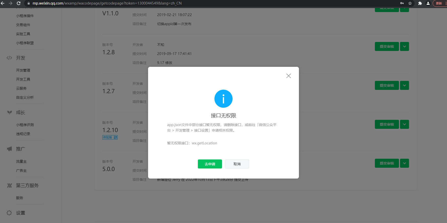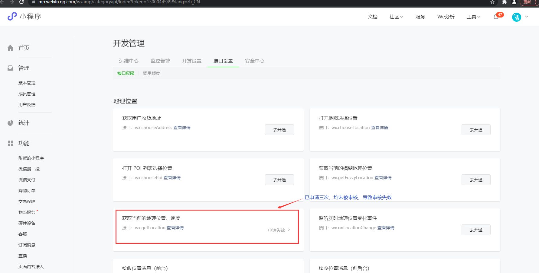 我司开发的小程序,武隆新玩法,因需要使用微信小程序定位功能,需申请wx.getLocation 接口权限,我司已经申请,并且一直得不到审核,导致申请失效,小程序appId:wx589e04fe7020cf49