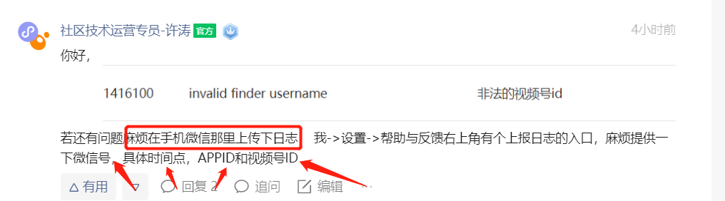 若还有问题麻烦在手机微信那里上传下日志: 我->设置->帮助与反馈右上角有个上报日志的入口,麻烦提供一下微信号,具体时间点,APPID和视频号ID
