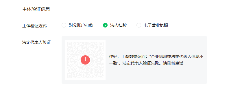 本人系个体工商户法人,身份证号同营业执照法人身份证号是同一个。现认证微信小程序,多次尝试法人扫脸验证均失败,已核对工商信息、法人身份信息完全一致,申请人工复核法人验证