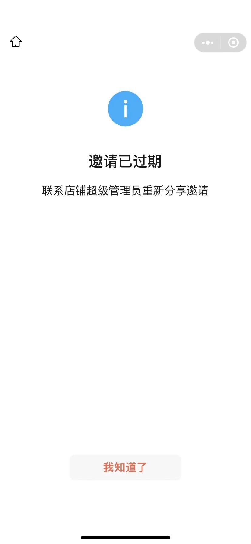 用小商店的超级管理员扫码邀请绑定账号管理店铺,每次打开小程序的邀请页面都提示邀请已经过期了,重复很多次了,还是一样的问题。扫码用的是超级管理员的号。过了10几天了,也没法解决。