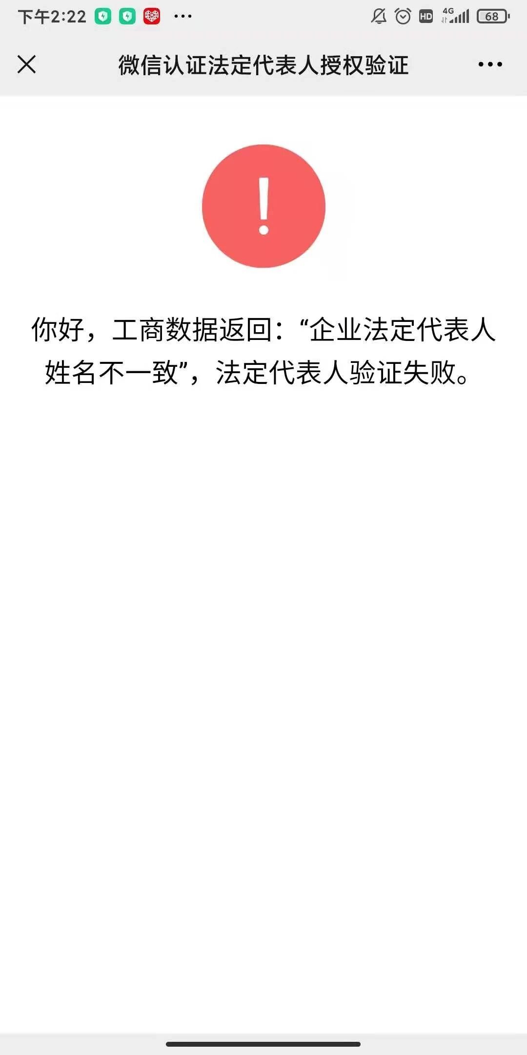 你好!我们的营业执照注册时间为2021年6月24日,距离现在已经超过15个工作日,为什么还是无法认证?工商数据返回:“企业法定代表人姓名不一致”,法定代表人验证失败。麻烦帮忙看看!谢谢!