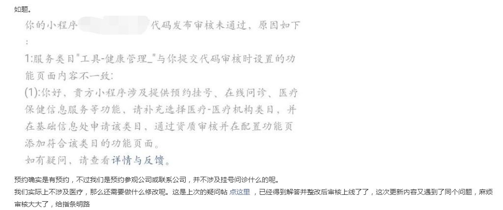 你好,经核实,小程序07-26,18:37:33提审版本,【干细胞治疗疾病】版块内容涉及提供专业、完善的健康信息服务,请补充医疗-医疗保健信息服务类目,并在基础信息处申请该类目,通过资质审核并在配置功能页添加符合该类目的功能页面。