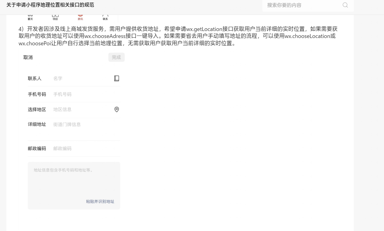 申请wx.getLocation接口权限已经提交了4-5次,一直无法通过审核,当前小程序业务涉及快递配送服务,提交订单时需要获取用户当前地址,用来匹配用户最近的收货地址,并计算配送费,完成订单下单配送服务,因此申请接口。