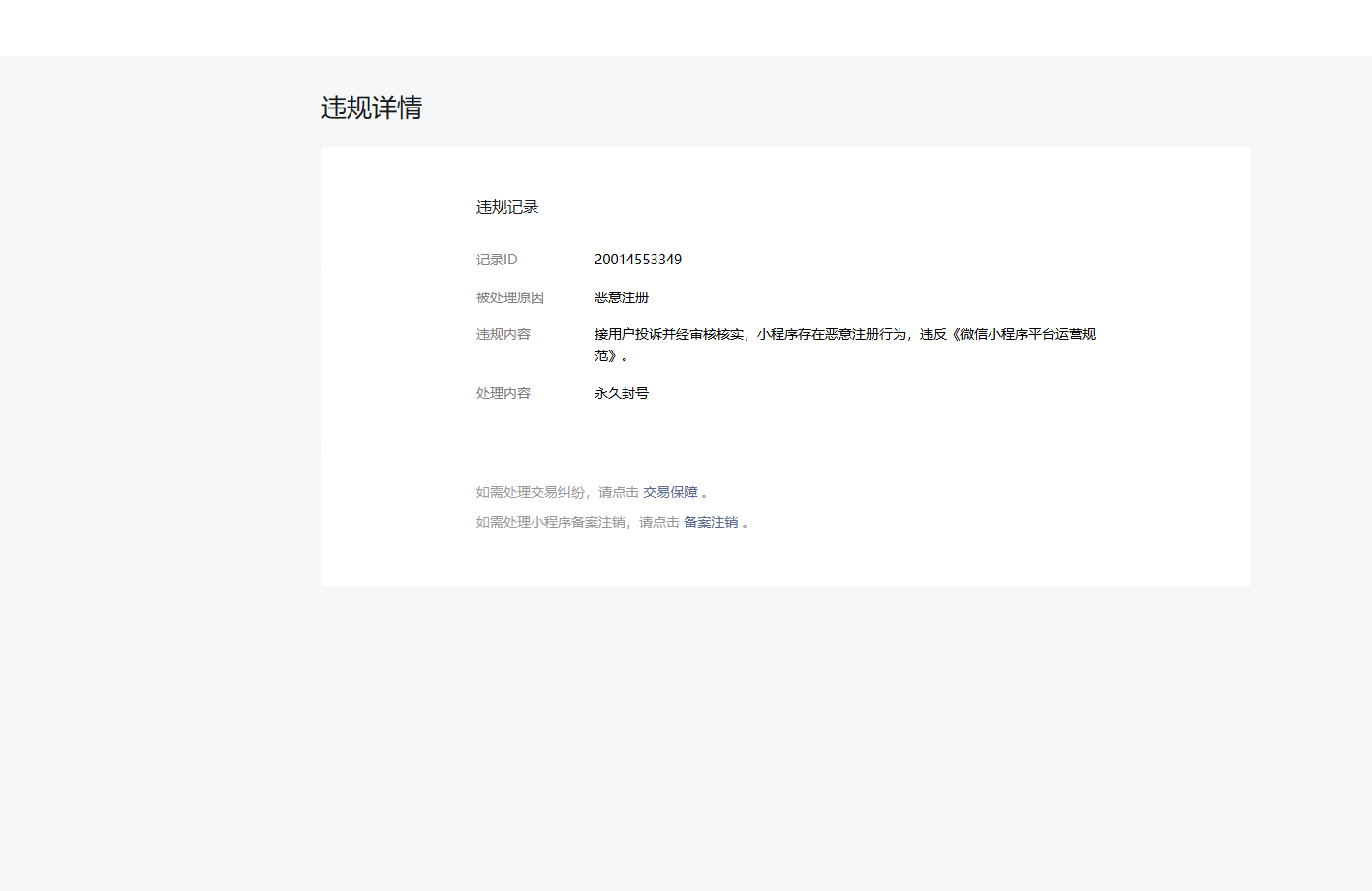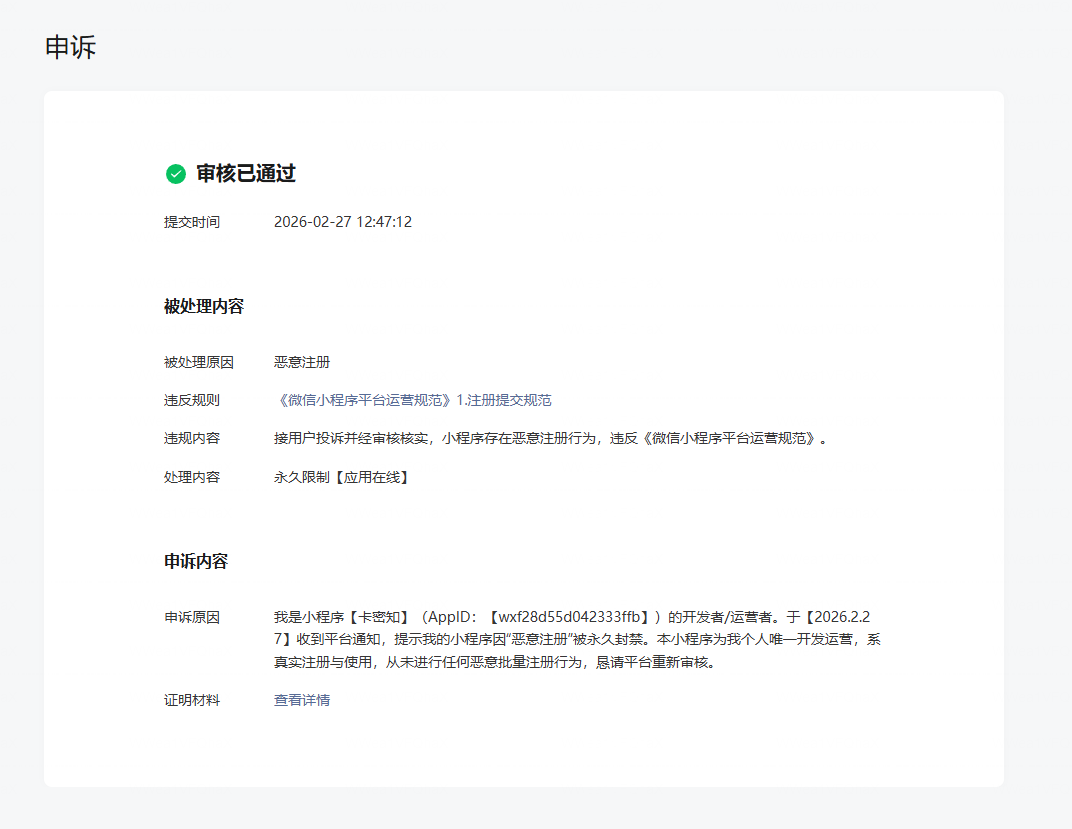 小程序就是我违规记录都申诉通过了,但是我登录还是显示违规,不能使用,麻烦解决一下!!!!