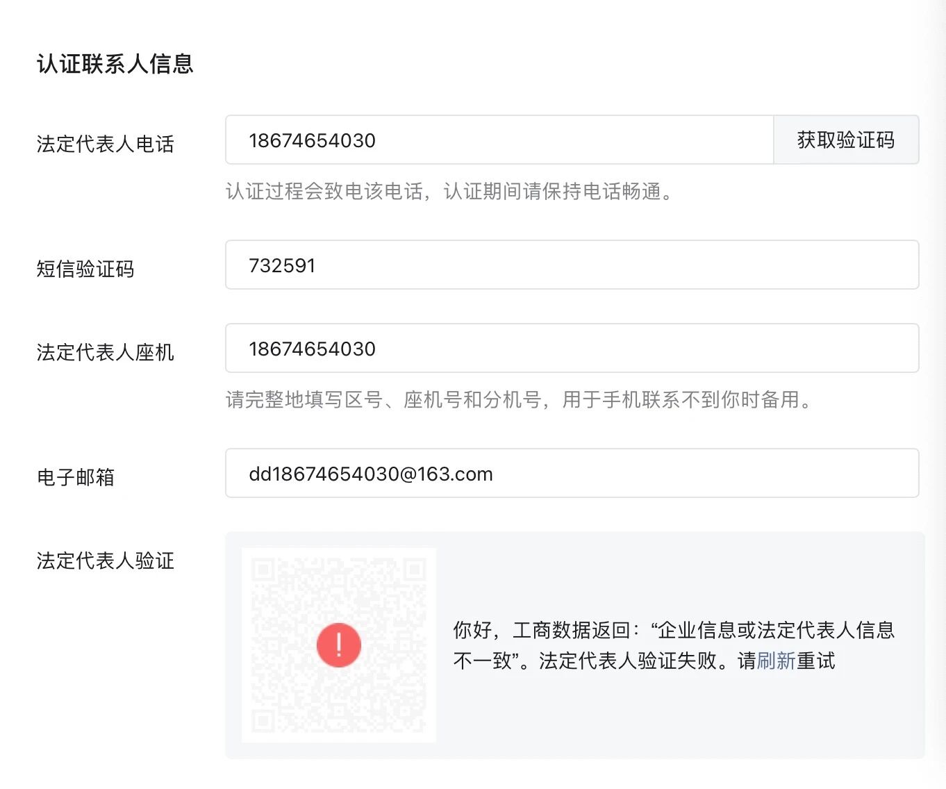 多次认证服务号时,法人验证提示“企业信息或法定代表人信息不一致”,去咨询工商局了说没有问题,麻烦帮忙解决!