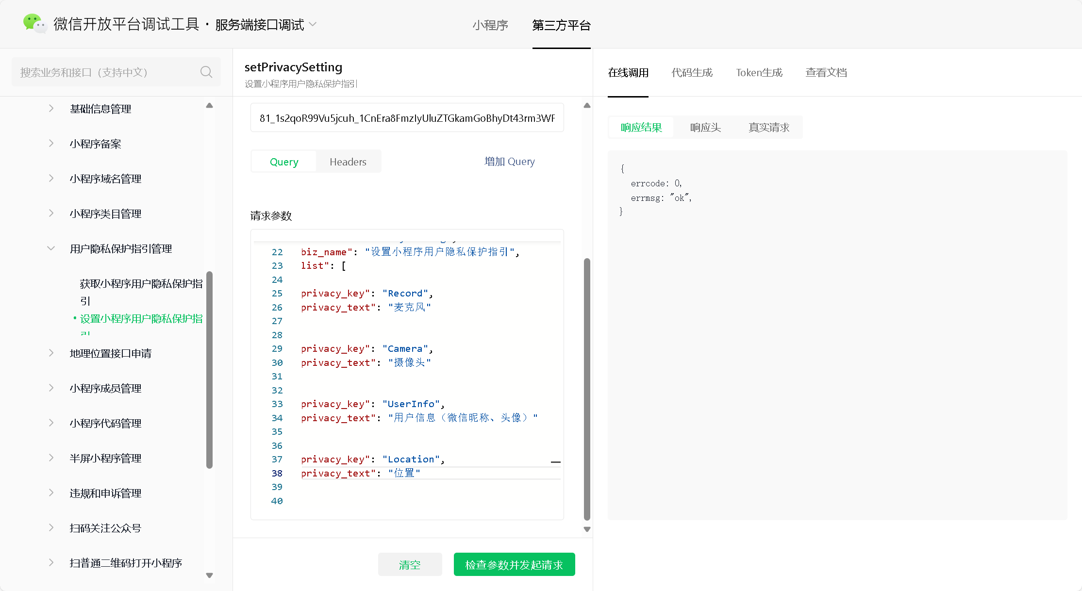 调用getPrivacySetting 注意返回的setting_list里有没有你setPrivacySetting时的参数 没有的话可能就是审核失败了 要改一下描述 另外注意他审核也是要时间的 不是瞬间就会过