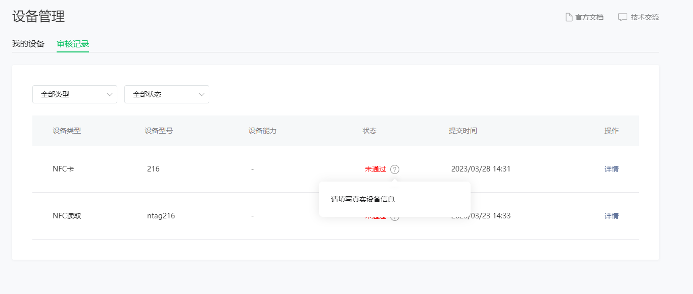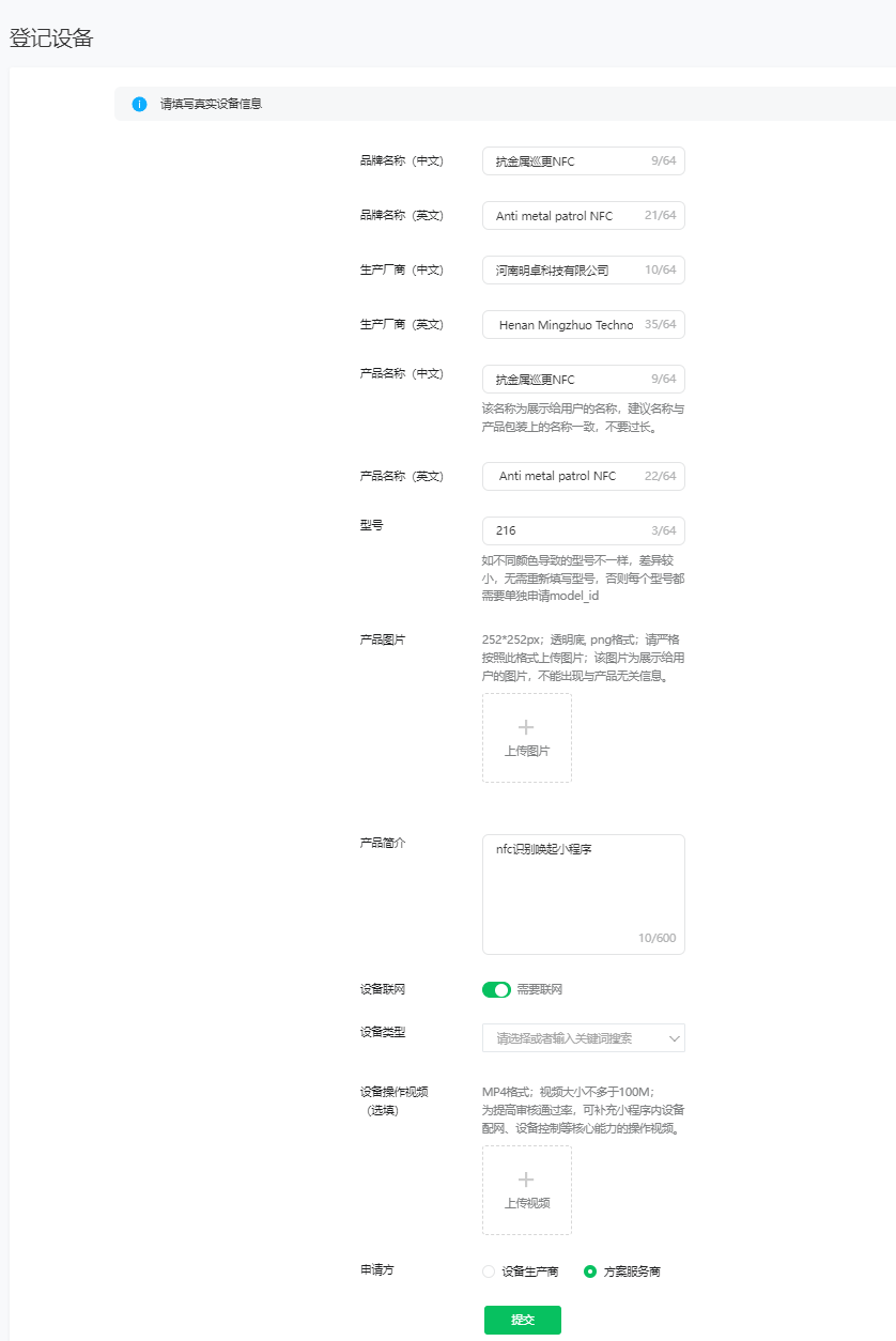 要制作一个NFC标签卡片唤起小程序功能 ,小程序后台添加了硬件设备申请。 审核未通过- 提示(请填写真实设备信息)