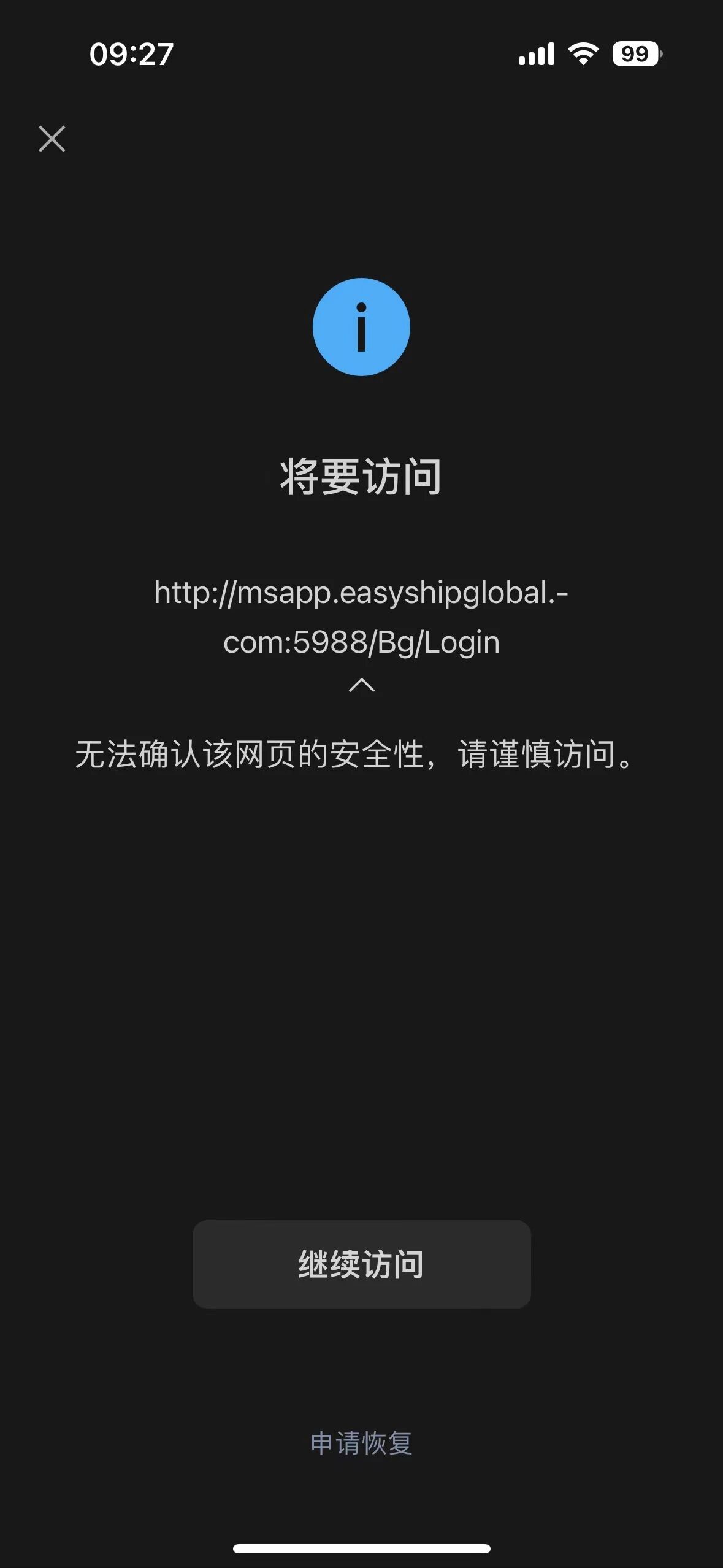 我们公司的内部订单管理查询网站,是普通企业的网站,http://msapp.easyshipglobal.com:5988/Bg/Login现在从微信里面点开就有,无法确认该网页的安全性,请谨慎访问的提示,在下面申请恢复也好多天了,没有结果,麻烦恢复一下,谢谢。这是我们公司网站,没有任何的风险。然后我们服务器是阿里云的香港服务器,没法进行IPC备案