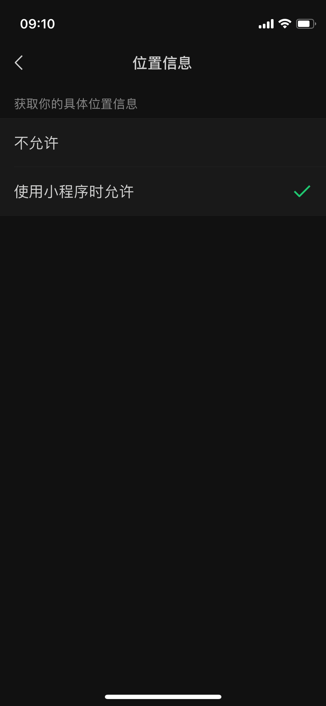 以上是在开发者工具中的。实际在iOS真机上,【使用小程序时】和 【使用小程序时和离开后】这两个选项误拒绝后都无法第二次拉起。