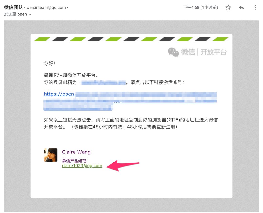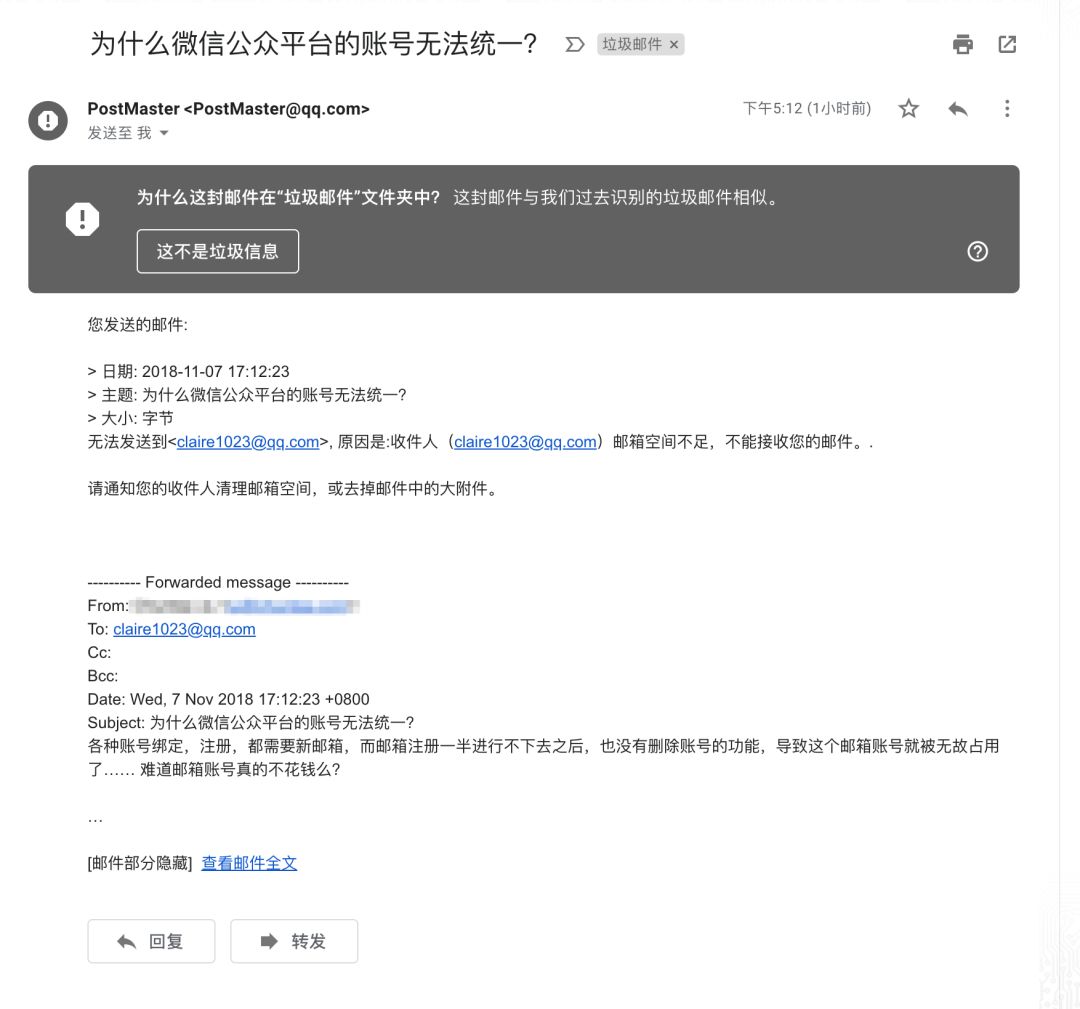 各种微信公众平台,微信商户,微信开放平台,微信小程序乱七八糟十几个邮箱了(很多都是注册到一半,就卡住了,然后也登录不上,也删不了,只能换邮箱)……实在是忍无可忍了,我就看到了微信公众平台的通知邮件里面产品经理的邮箱地址,我就发了一封邮件。本来以为顶多也就是石沉大海,万万没想到,我收到回信了!!!