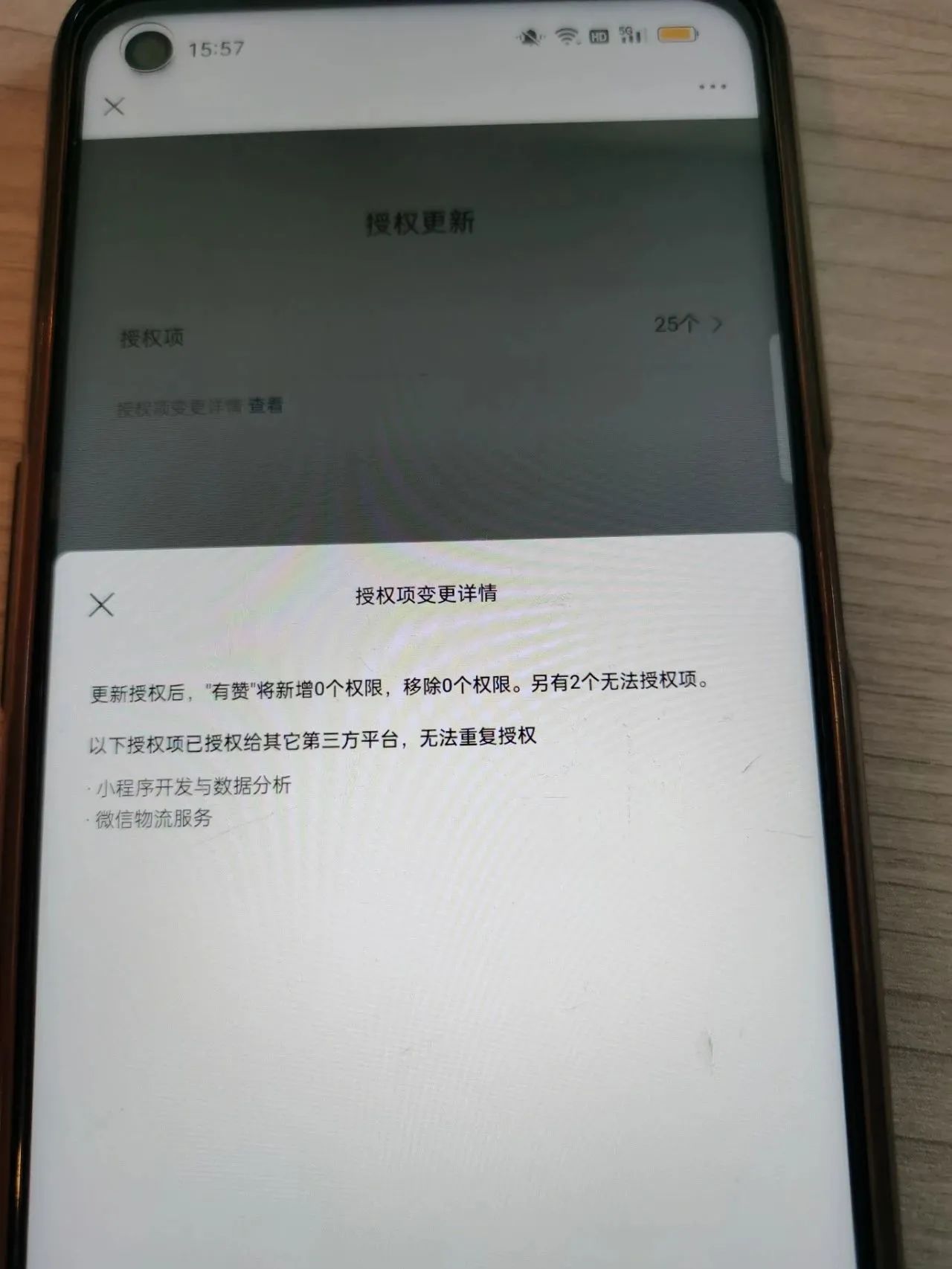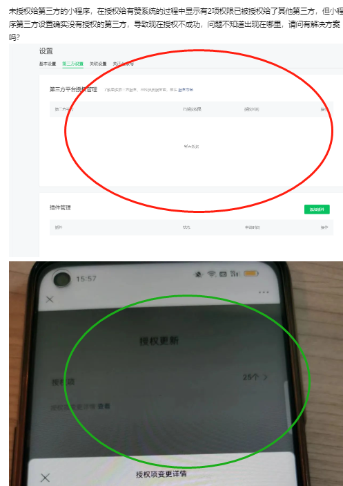 未授权给第三方的小程序,在授权给有赞系统的过程中显示有2项权限已被授权给了其他第三方,但小程序第三方设置确实没有授权的第三方,导致现在授权不成功,问题不知道出现在哪里,请问有解决方案吗?