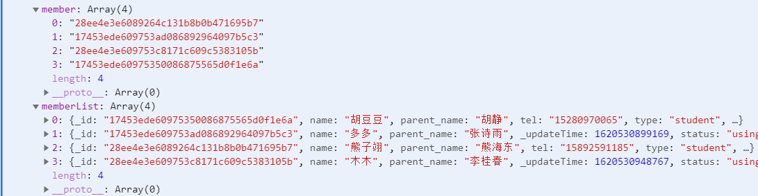可以看到效果基本出来了,member是原始数据是user表得主键构成得数组,然后memberList是根据member聚合后得到对象数组,但是有个大问题,就是顺序居然发生了变化。