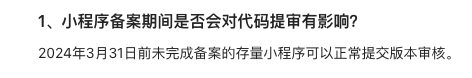 2024年3月31日前未完成备案的存量小程序可以正常提交版本审核。