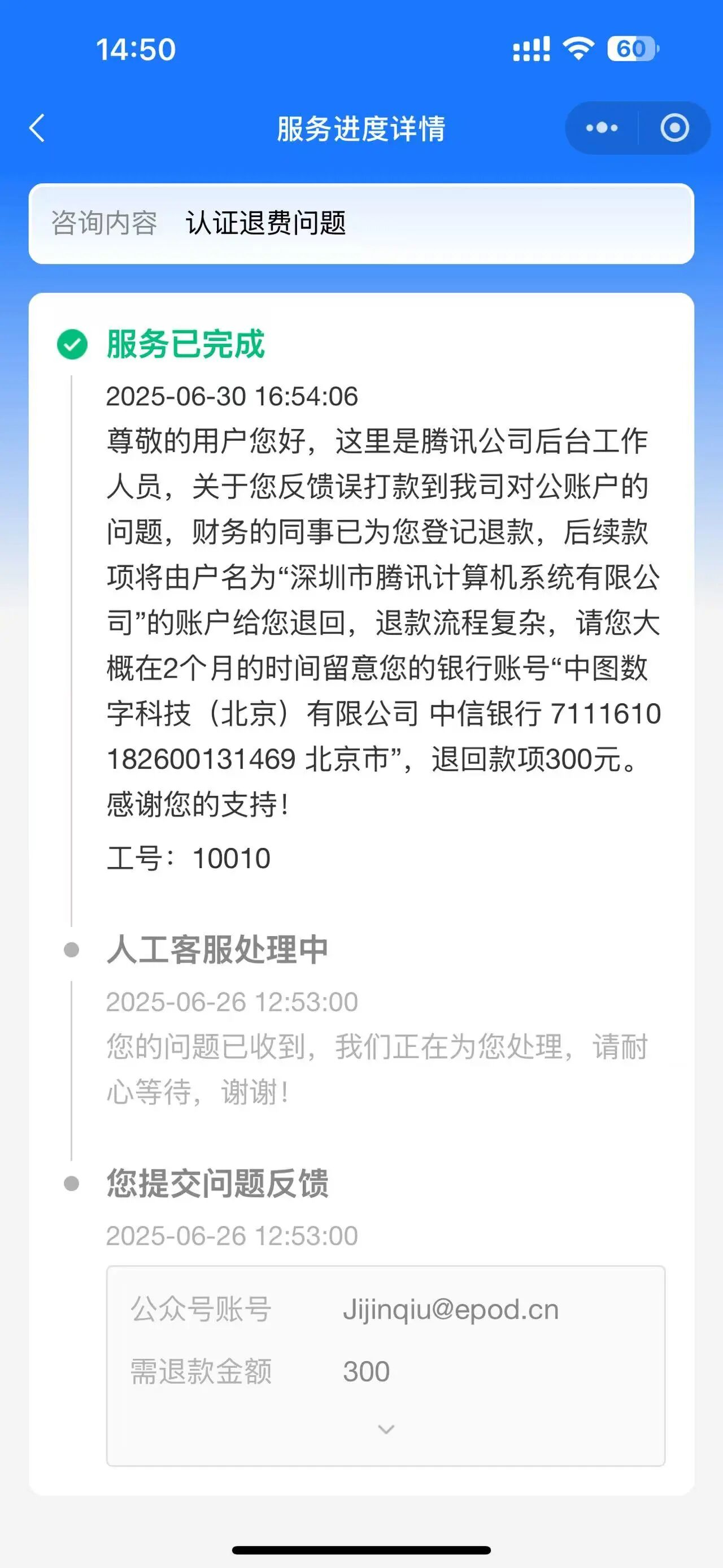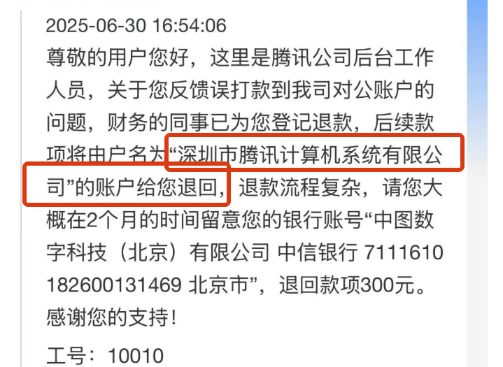 都告诉你是【深圳市腾讯计算机系统有限公司】账户给你退的,还无法区分,那是你们财务牛。