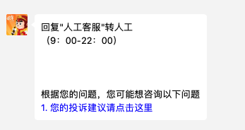 回复"人工客服"转人工(9:00-22:00)根据您的问题,您可能想咨询以下问题 <a href="weixin://bizmsgmenu?msgmenucontent=1. 您的投诉建议请点击这里&msgmenuid=0">1. 您的投诉建议请点击这里</a > |