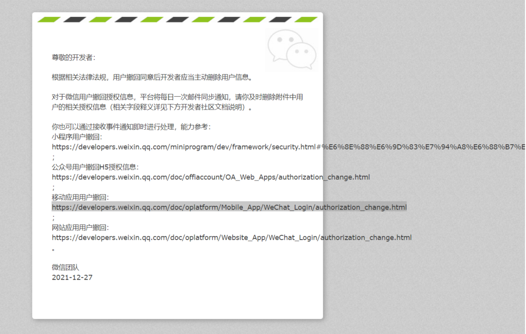 1)按以下通知开发的用户取消授权接收通知的API 获取不到取消授权的通知(注:API肯定没问题,因为公众号关注、取关、菜单等事件通知都能正常接收),请问“用户撤销授权”的API通知是没有启用吗还是有什么问题呢?