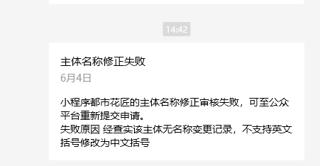 我们小程序的经营主体名称的括号是英文字符与营业执照不一致,需要修改为营业执照上中文字符的,已影响与视频号做技术链接,有什么解决办法?