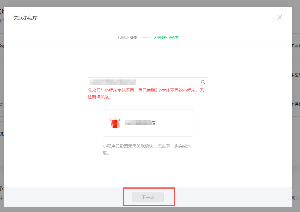 无需关联,但是下一步按钮也没法点击呢,服务号已经关联了三个不同主体的小程序了
