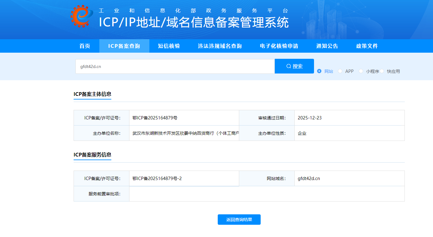 gfdt42d.cn这个网站是武汉市东湖新技术开发区欣晏中纳百货商行(个体工商户)使用,已经备案,该网站根域名已于2025-12-23经审核通过企业级备案 (备案号:鄂ICP备2025164879号-2),不包含违规内容,打开提示风险,麻烦解封