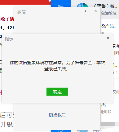 pc版过一会就提示登陆环境异常,为了账号安全,本次登录失效。麻烦处理下,谢谢。微信号:lfhy01001