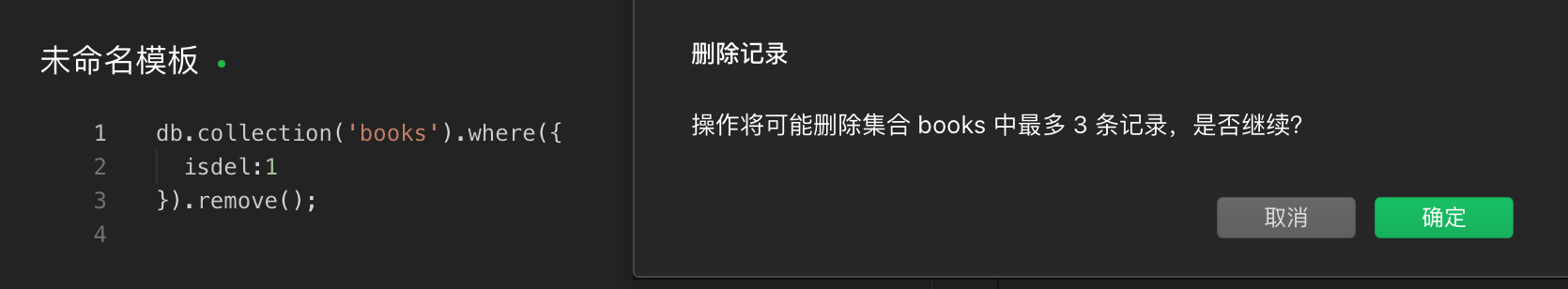 deldatabses() { const db = wx.cloud.database(); db.collection('books').where({ isdel: 1 }).remove().then(res => { console.log(res); }); }