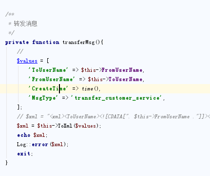 转发消息的时候用 json 返回,因为微信后台配置的是 json