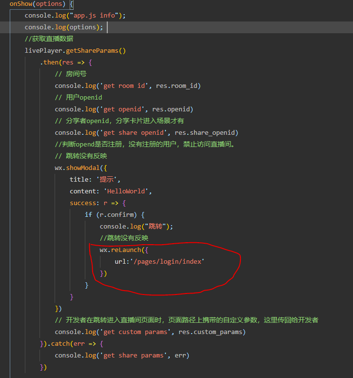 代码如图:目的是希望通过用户openid判断是否注册,已注册的继续留在直播间观看,没有注册的先跳转注册页面。