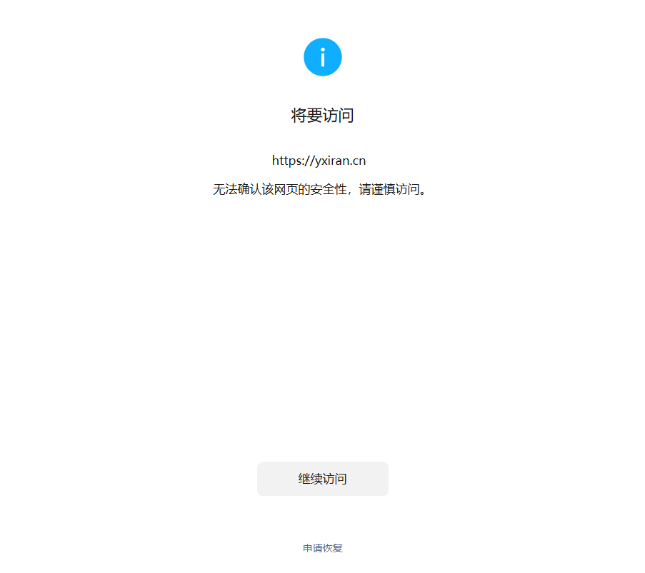 尊敬的微信开发社区管理员,本人域名:yxiran.cn。刚建立个人网站,在微信点了几下就出现了拦截:继续访问,被拦截。