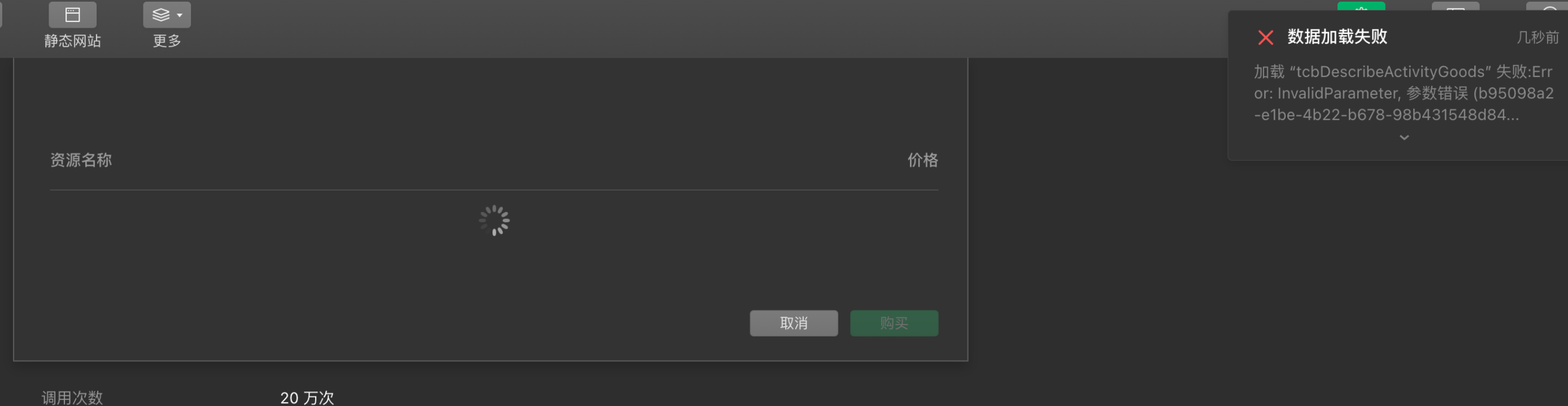 开发者工具-云开发控制台-对应按量付费环境-资源包-短信资源包,出现如上报错界面,无法购买短信资源。