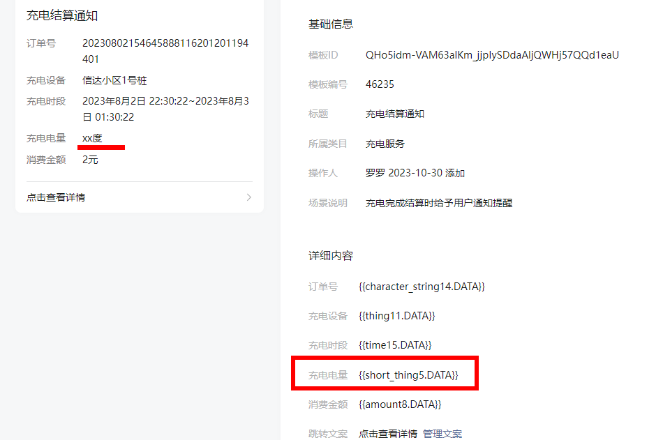 还有 编号46236的 “充电完成提醒” ,里面的结束原因 字段类型为phrase,这个最多5个汉字,限制太多了,实际业务中 充电结束原因较多,5个字也满足不了,