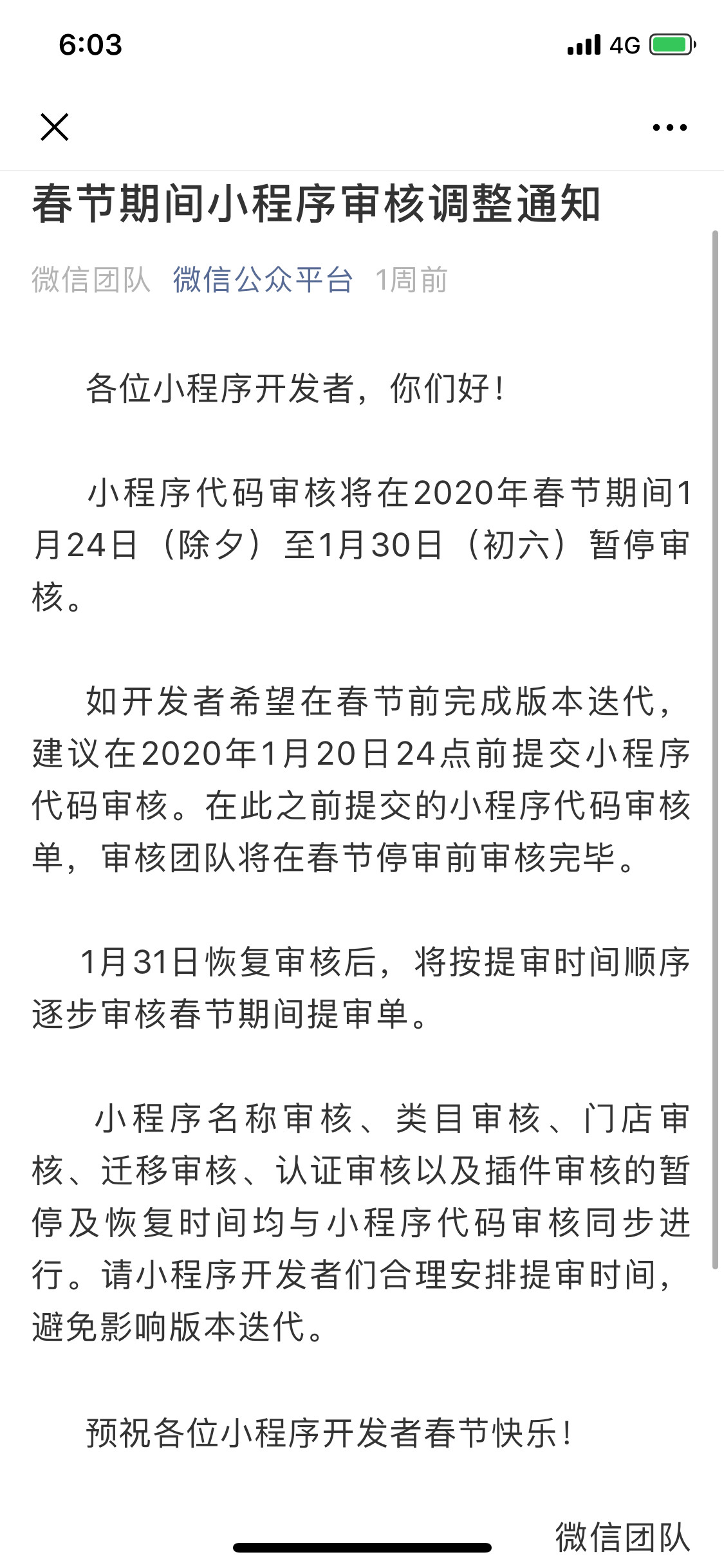 2020年春节小程序的版本更新什么时候停止审核啊?