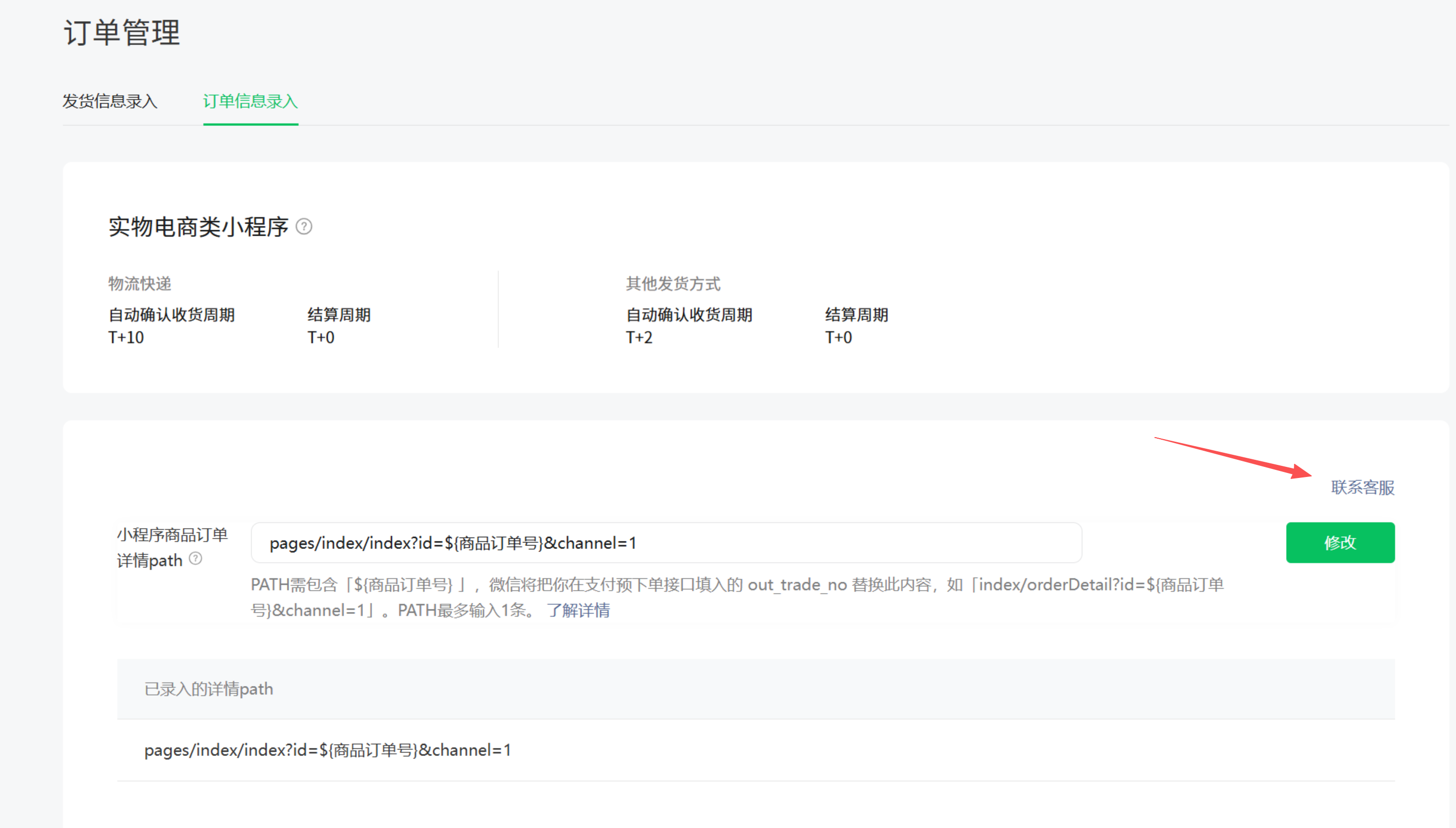 可在该路径进行咨询下哈,路径:小程序管理后台https://mp.weixin.qq.com/ 支付与交易-订单管理-订单信息录入-联系客服