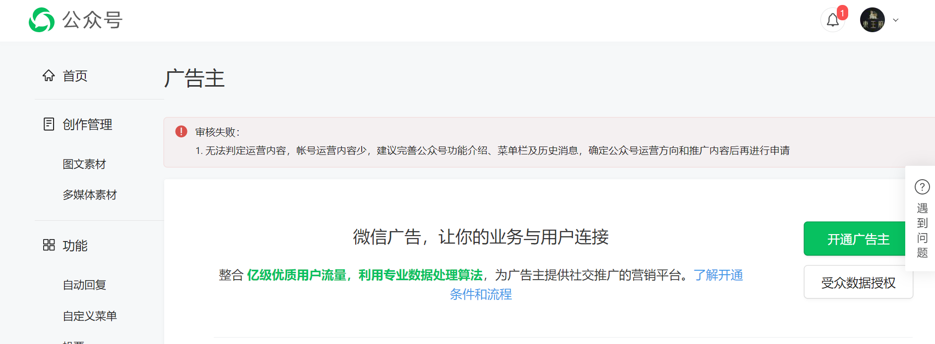 多次申请开通广告主,都是审核失败,回复的原因都是“无法判定运营内容,帐号运营内容少,建议完善公众号功能介绍、菜单栏及历史消息,确定公众号运营方向和推广内容后再进行申请”。