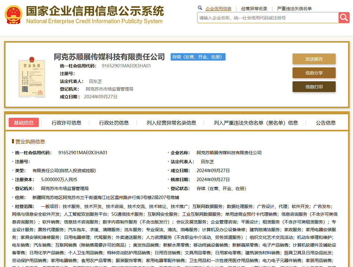 营业执照是09月27日注册,国家企业信用信息公示系统可以查询到,统一社会信用代码:91652901MAE0X3HA01