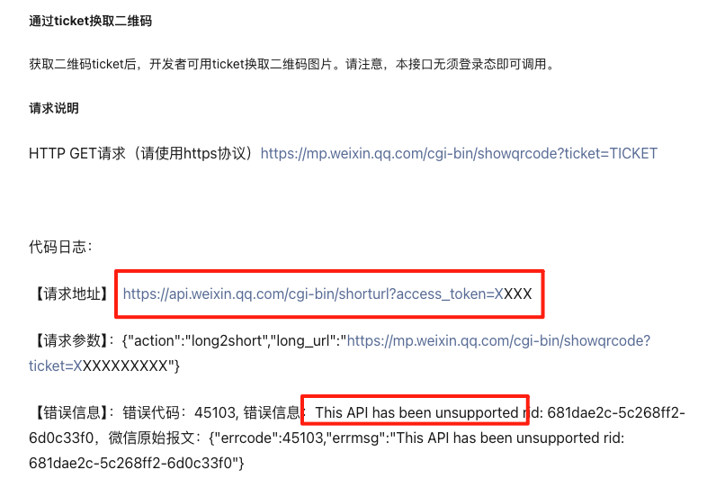通过ticket换取二维码接口是支持的,你都不是调用这个接口报的错,你是调用【长链接转短链接口】报错的,这个接口下线很久了。