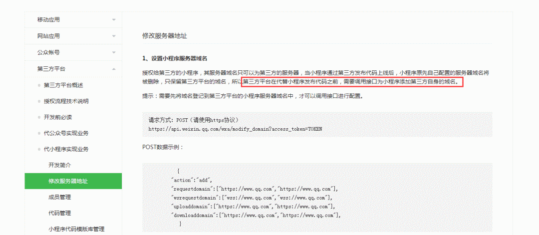 2、发布代码之前调用此接口为已授权的小程序平台添加服务器合法域名