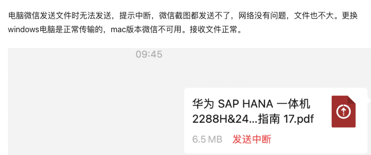 电脑微信发送文件时无法发送,提示中断,微信截图都发送不了,网络没有问题,文件也不大。更换windows电脑是正常传输的,mac版本微信不可用。接收文件正常。