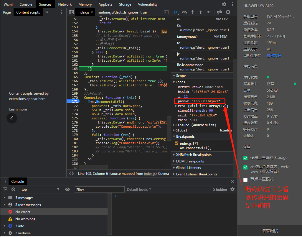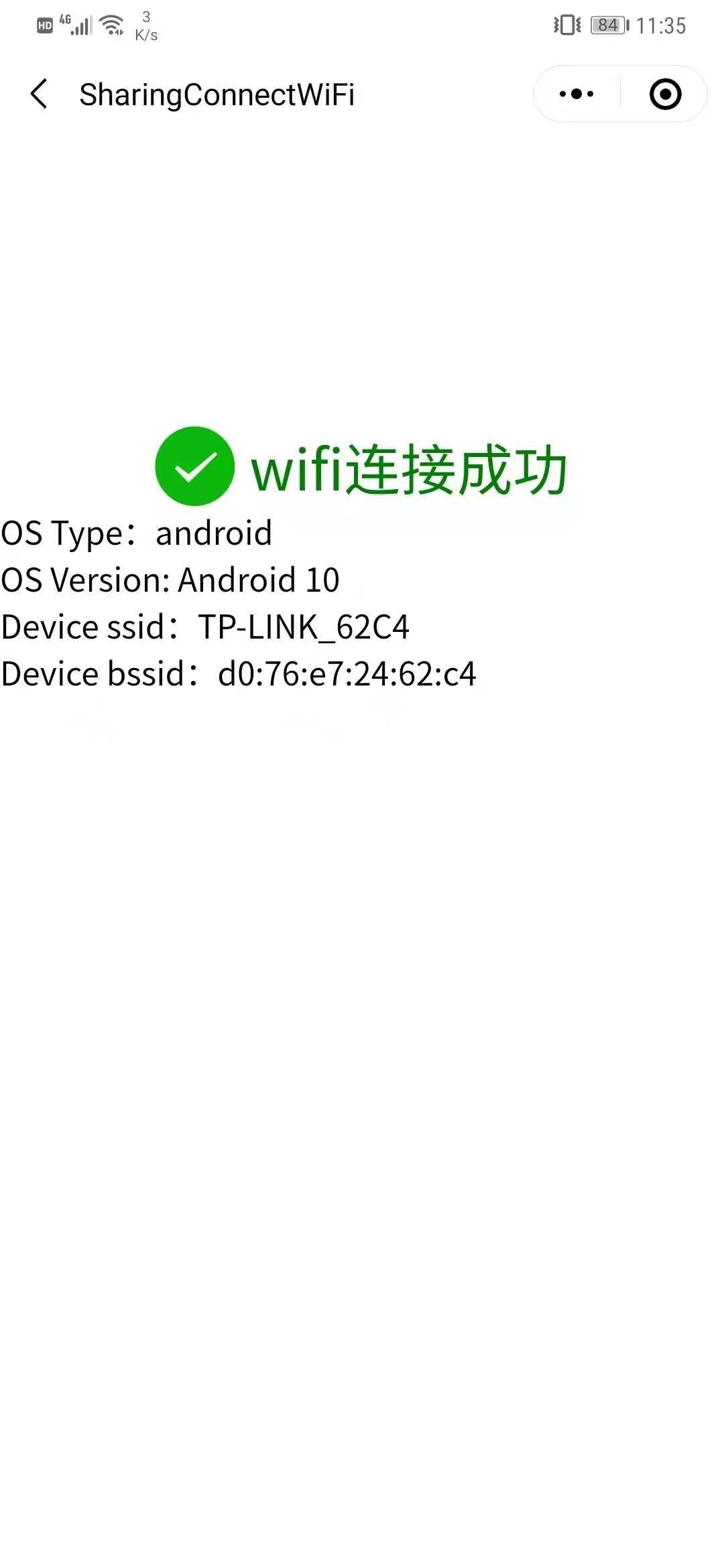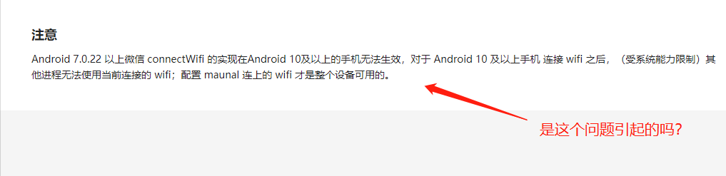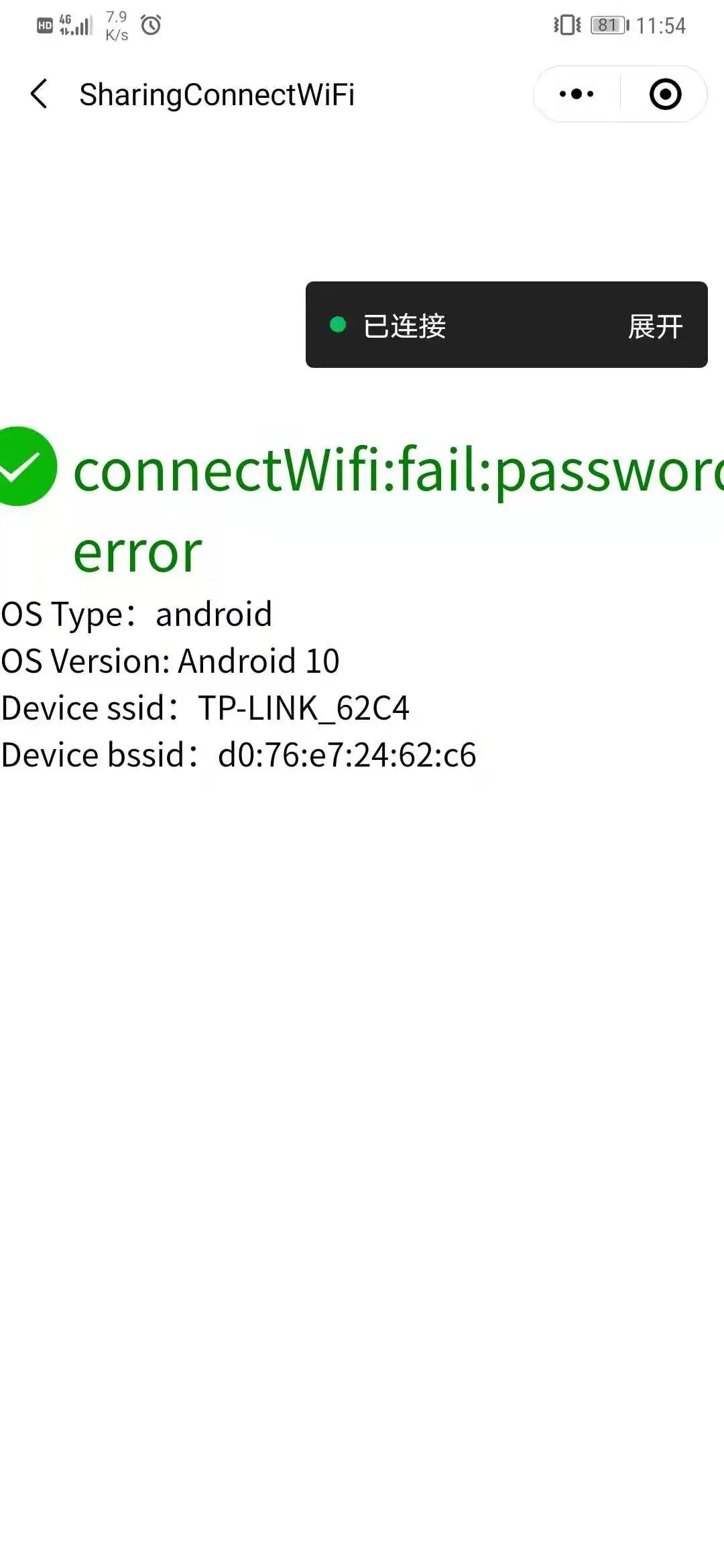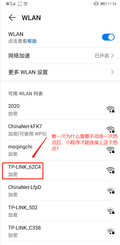 - 一开始我的安卓手机连接过名称为TP-LINK_62C4的网络,然后忘记网络,使用微信小程序(调用wx.connectWifi接口)去连接这个网络,可以连接上这个网络,ssid和password是通过input输入传参进去的。