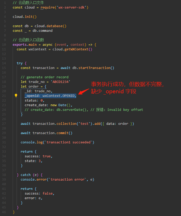 3、 但当云函数创建记录时启用事务时,事务可能执行完成,但数据不完整,缺少代码中主动增加的 _openid 字段
