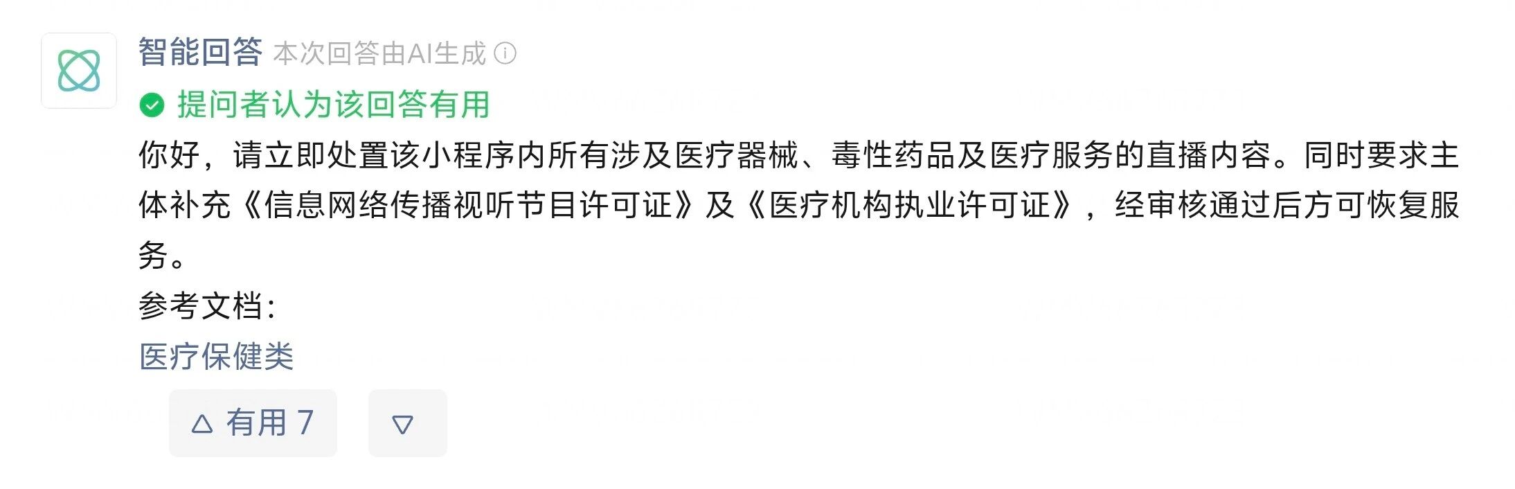 2. 类目整改:依据《运营规范》5.2.2,要求主体补充《信息网络传播视听节目许可证》及《医疗机构执业许可证》,经审核通过后方可恢复服务;