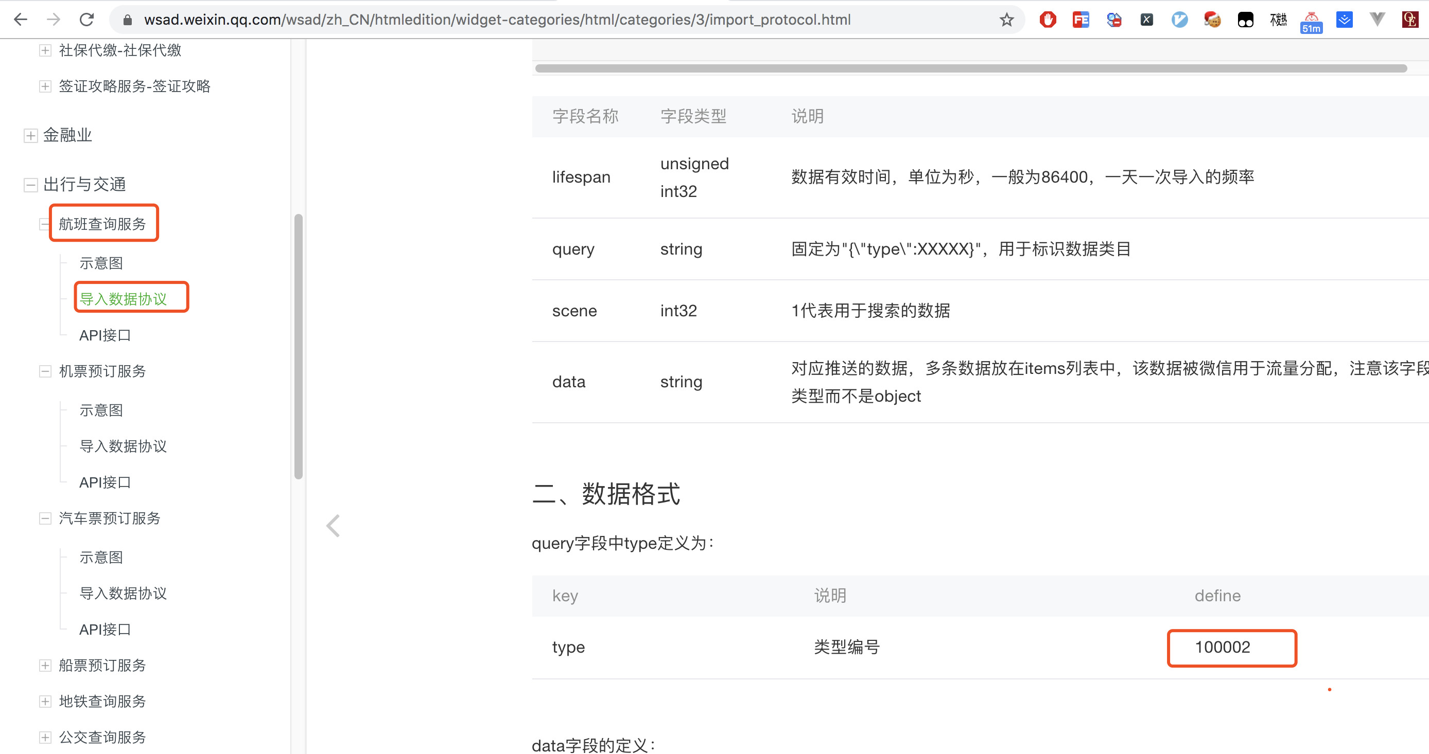 【航班查询服务】导入抽样数据的文档和线上模板总览里面的文档里面描述的query.type 不一样,下载的文档中 type 为 100004,在线文档的 type 为 100002。如下图: