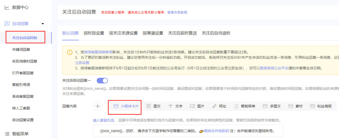 接入后直接设置公众号的关注后自动回复,选择小程序即可。