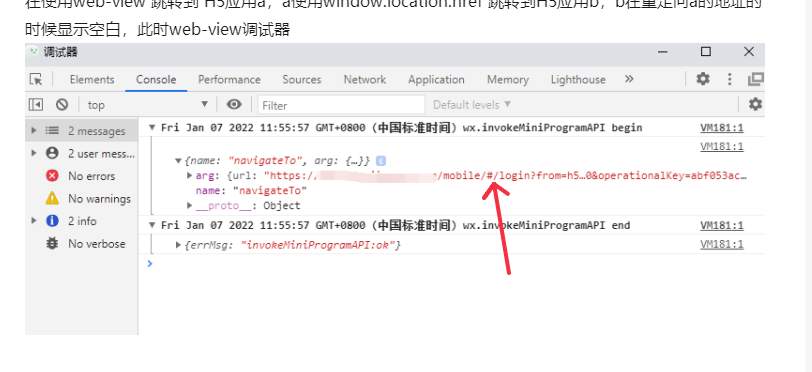 在使用web-view 跳转到 H5应用a,a使用window.location.href 跳转到H5应用b,b在重定向a的地址的时候显示空白,此时web-view调试器
