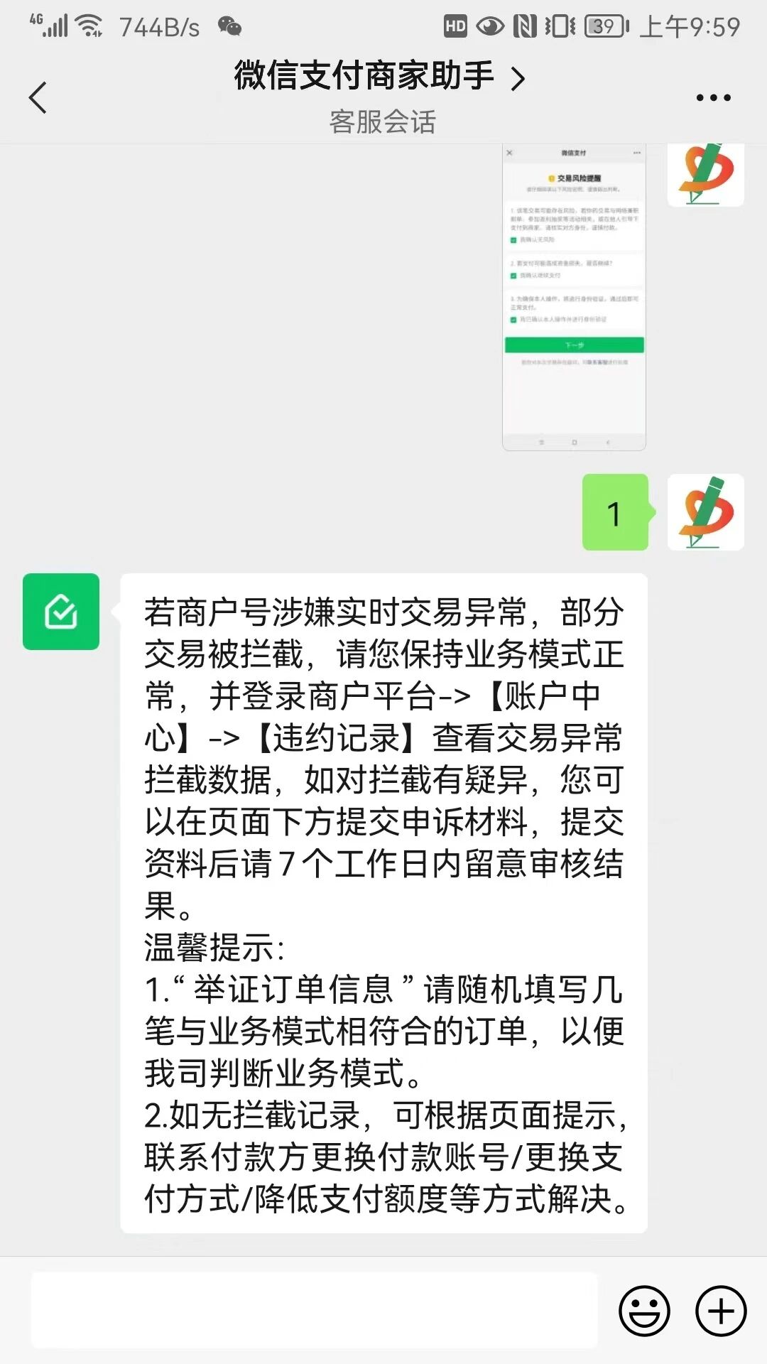 若商户号涉嫌实时交易异常,部分交易被拦截,请您保持业务模式正常,并登录商户平台->【账户中心】->【违约记录】查看交易异常拦截数据,如对拦截有疑异,您可以在页面下方提交申诉材料,提交资料后请7个工作日内留意审核结果。