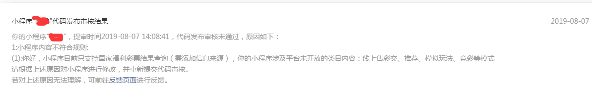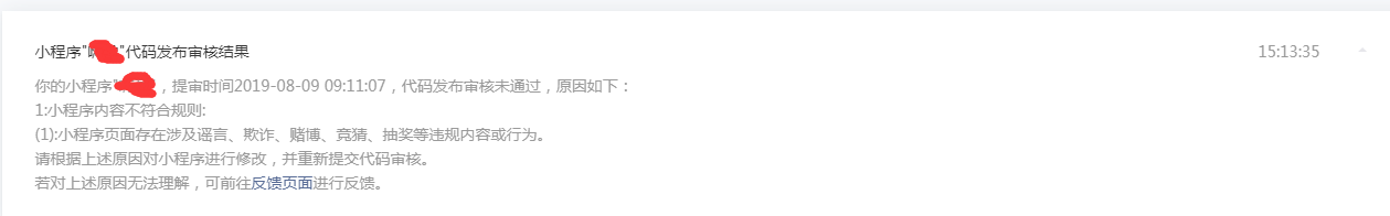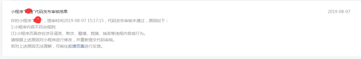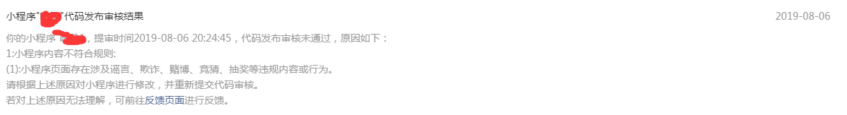 从8月6日开始,审核不通过提醒:(1):小程序页面存在涉及谣言、欺诈、赌博、竞猜、抽奖等违规内容或行为。