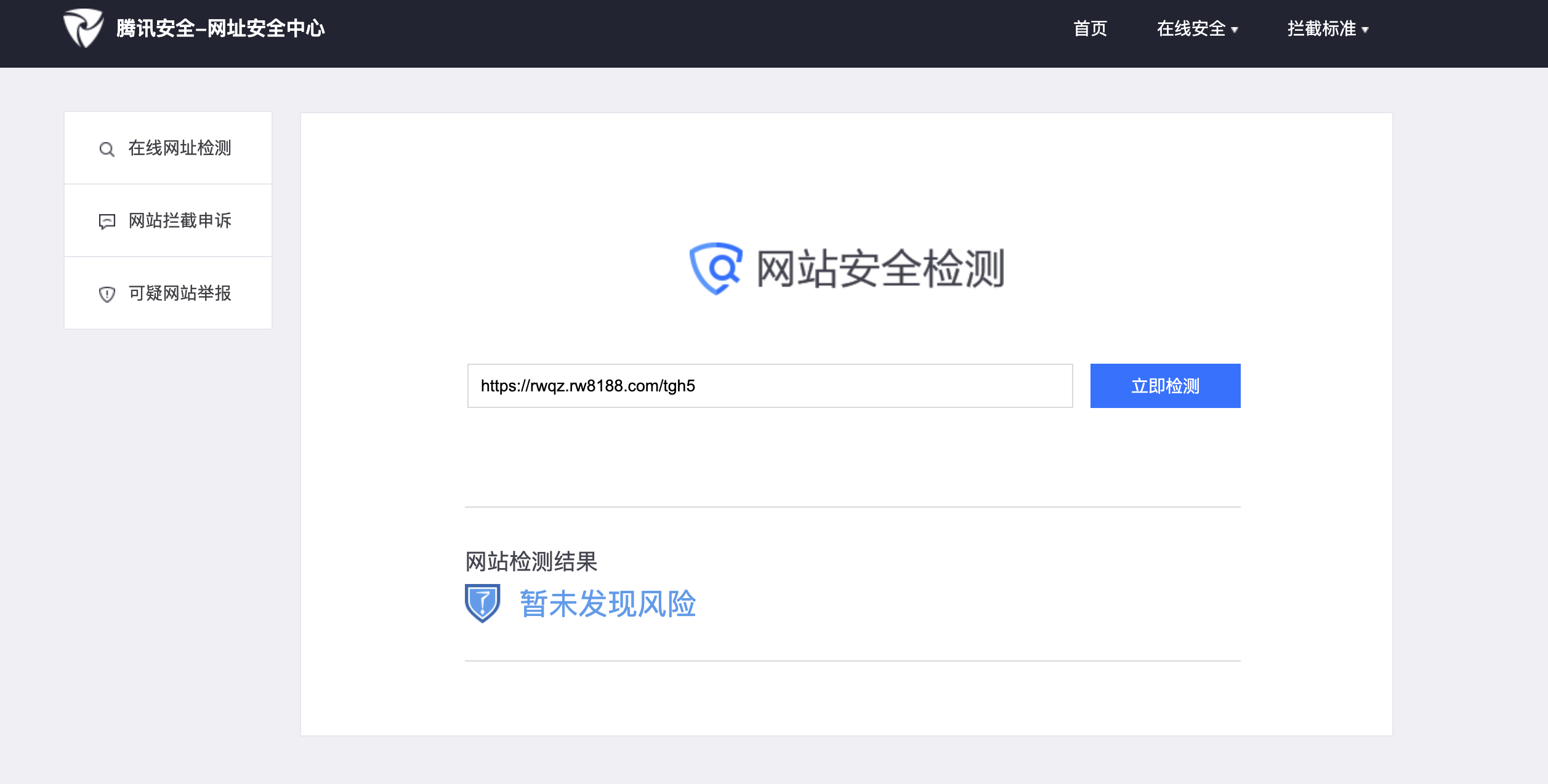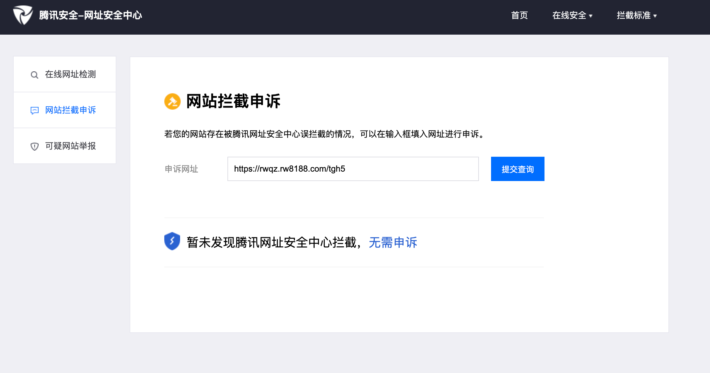 请关闭链接 https://rwqz.rw8188.com/tgh5 无法确认该网页的安全性,请谨慎访问’的提示,本网站域名早已备案,网站内容合法合规,根据《微信外部链接内容管理规范》及客服指引和腾讯安全-进行自查核实,未发现拦截网址和违规网址。本域名 rw8188.com 备案号:粤ICP备17054337号