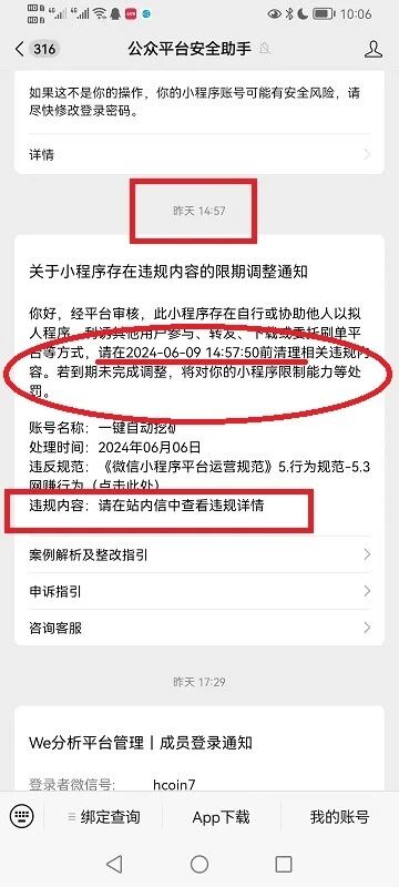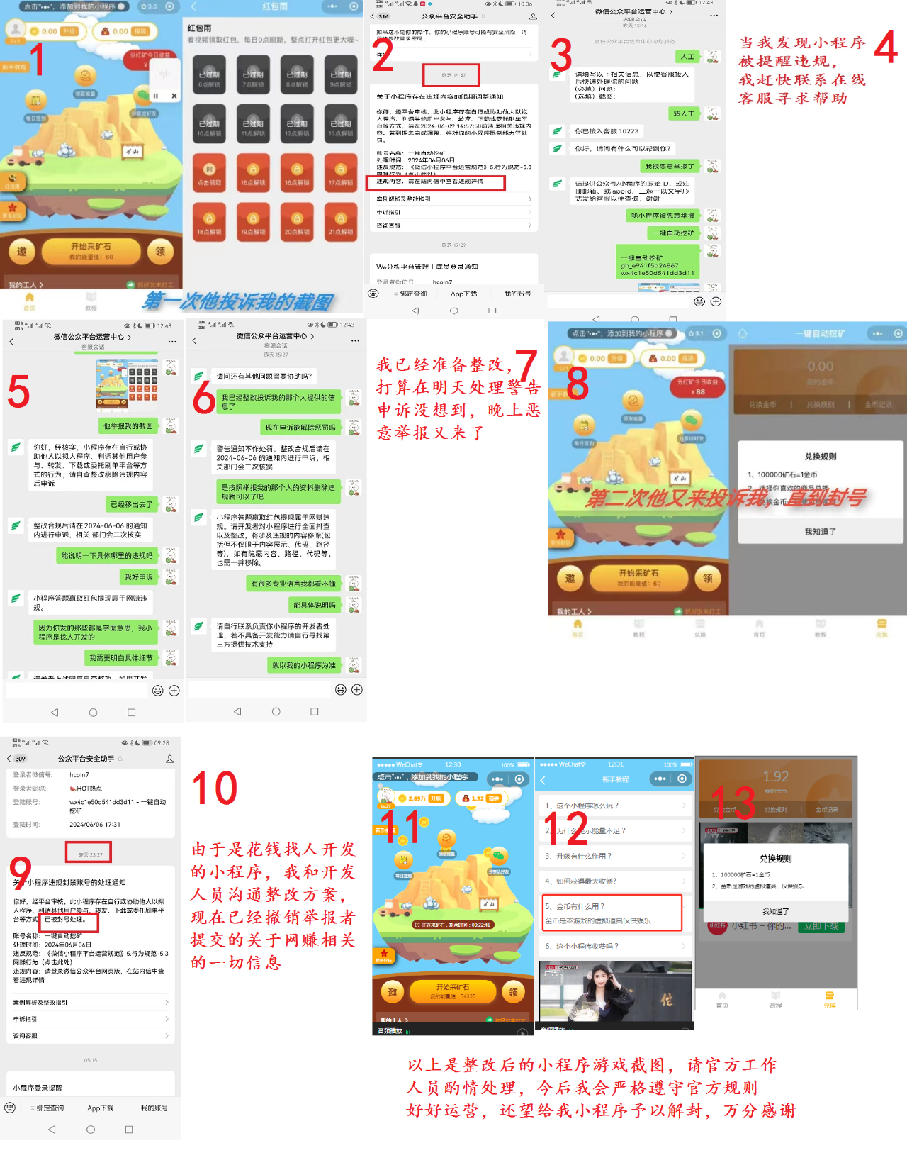 2024年6月6日下午14点57分,我小程序:一键自动挖矿(wx4c1e50d541dd3d11)收到违规限期调整,要求在在6月9日前调整完成。我很快联系在线客服寻求帮助,并与开发人员商议调整方案,没想到予6月6日晚23点27分就被用户举报导致封号,离官方规定的调整时间还有两天。请官方人员结合现实情况给予我的小程序解封,我会在以后的运营过程严格按照官方规则行事,如有触犯,甘愿受罚