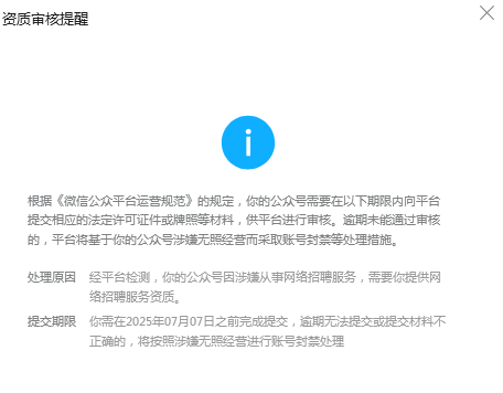 可以通过人工客服反馈,或者在资质提交页面提交一份说明,说明账号主要运营什么,承诺不涉及网络招聘。