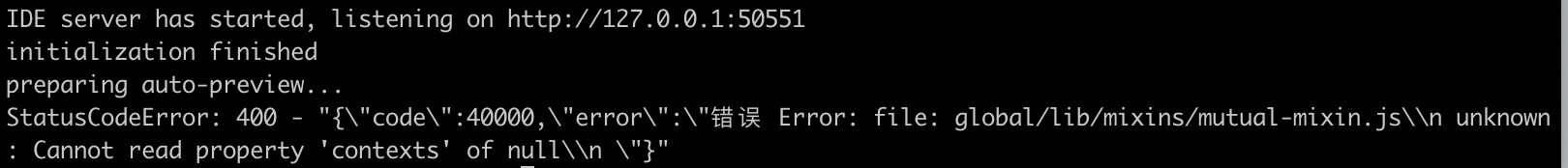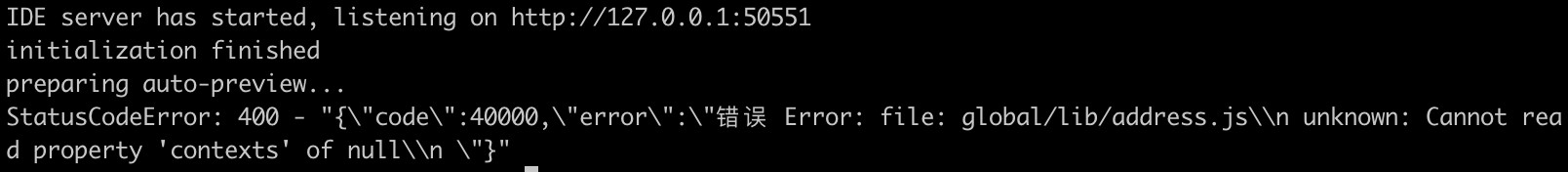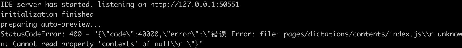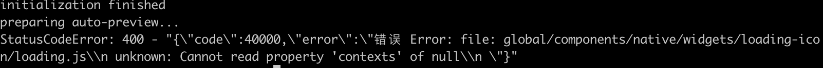 `{"code":40000,"error":"错误 Error: file: lib/storage/word-storage.js\\n unknown: Cannot read property 'contexts' of null\\n "}`,